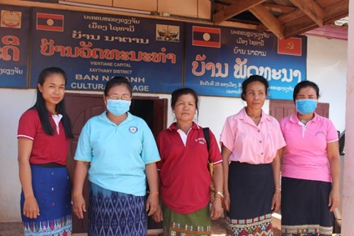 20200917-expanding-ebs-photo6 Ms Chanthachone (second from left) with her fellow village health volunteers gathered outside the village head office