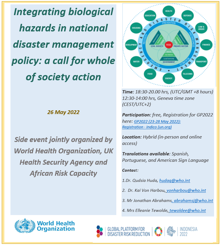 - Share experience and good practices on the integration of biological and other priority hazards in national and local strategies and plans for disaster risk reduction