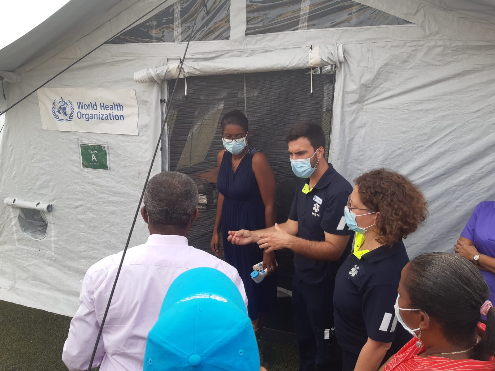A team of WHO technical and health experts setting up a COVID-19 treatment center in a football field in São Tomé and Príncipe, which was subsequently run by an Emergency Medical Team. ©WHO/2020/Jean Pierre Veyrenche