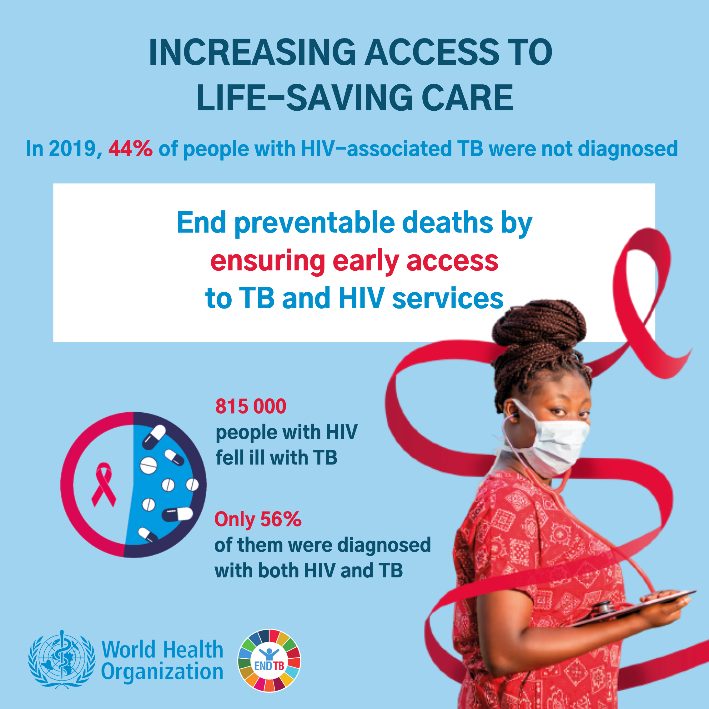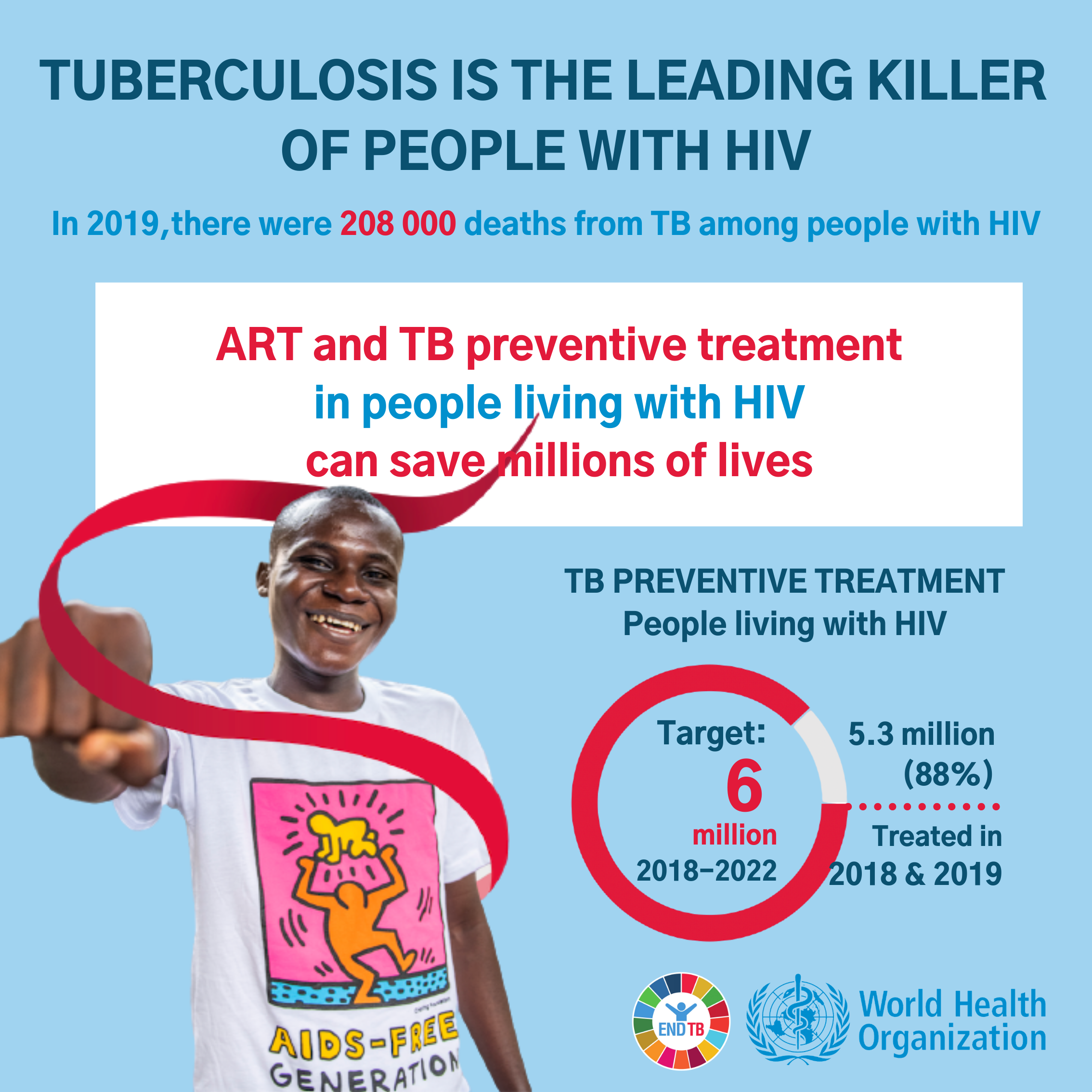 A primary factor behind TB mortality among people with HIV is late diagnosis. This year’s WHO Global Tuberculosis Report highlighted that globally 44% of people with HIV-associated TB were not diagnosed in 2019. Autopsy studies among individuals who had died from AIDS report that almost half (46%) of them had TB that had not been detected prior to death. Enhancing the detection of TB among people living with HIV is therefore critical. TB preventive treatment (TPT) among people living with HIV has been shown to significantly reduce the risk of developing TB and dying from it. There has been impressive scale-up of TPT recently but only 50% of people starting ART initiated TPT in 2019, with a vast majority of those already on ART yet to receive it.