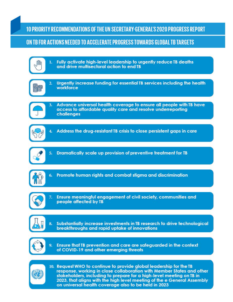 Member States are urged to implement the 10 priority recommendations to put the world on track to reach agreed targets by 2022 and beyond, and to reduce the enormous human and societal toll caused by TB.