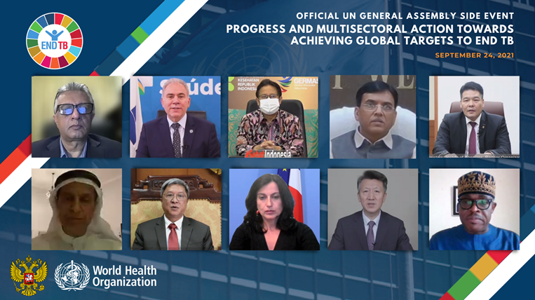 Hundreds of people virtually joined the official UN General Assembly high level side-event: "Progress and Multisectoral Action towards achieving global targets to end TB" co-organized by the World Health Organization (WHO) and the Russian Federation on 24 September 2021. Held on the sidelines of the 76th session of the UN General Assembly (UNGA), the event brought together a distinguished line up of speakers including WHO and UN Leadership, the President of the UN General Assembly, Health Ministers and national ministerial delegations, partners and civil society – all who are invested in the same cause of wiping out this leading infectious killer.
