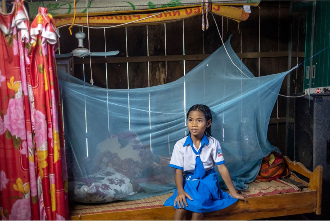 Nay Ho Quy, 9, daughter of a village health worker, sits in front of her bed net in Gao Village, Phu Yen Province, Viet Nam. © WHO/L. Pham