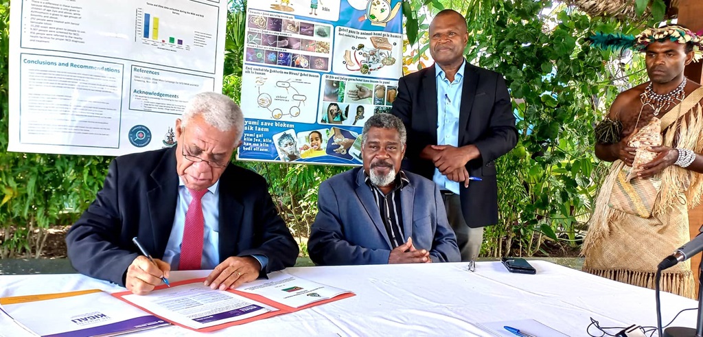Prime Minister Bob Loughman, accompanied by Health Minister Bruno Leingkone and Health Director-General Russel Tamata, endorses the Kigali Declaration and commits to ending neglected tropical diseases, including trachoma, by 2030. Credit: Ministry of Health of Vanuatu